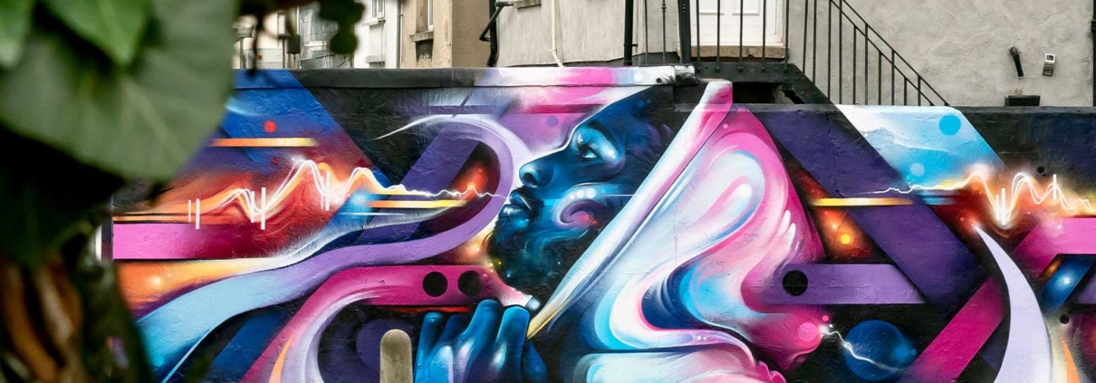 Responding to the chaos of the world, this piece carries my usual underlying message of love and hope, expressed through an interpretation of music and sound waves. Continuing my focus on blues and purples, I portrayed a male figure trying to stay positive and focused during challenging times.
